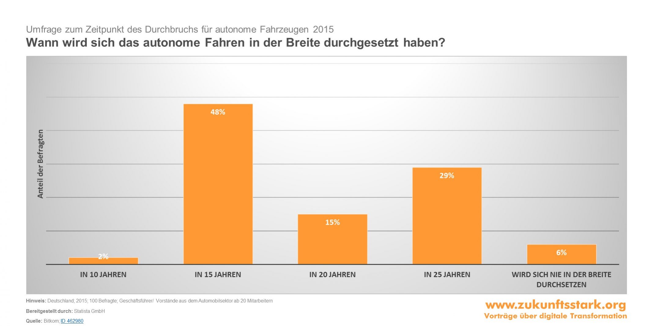 Fragt man die Führungskräfte von Unternehmen der deutschen Automobilindustrie so sind diese mehrheitlich überzeugt, das das autonome Auto innerhalb der nächsten 15-20 Jahre für die breite Öffentlichket in Deutschland verfügbar sein wird. Durch das Autonome Auto werden sich in Zukunft Mobilität und Geschäftsmodelle radikal verändern. Dieses trifft sowohl die Automobilhersteller selbst aber auch andere Unternehmen wie z.B. die Bahn, Taxiunternehmen oder die Immobilienwirtschaft. Es bleibt abzuwarten, ob die deutsche Automobilindustrie hier auch die entsprechenden Antworten parat hält, um sich in Zukunft gegen mögliche Konkurrenten wie Google und Co. zu behaupten. Wie bereits in anderen Branchen gesehen, hört die Digitalisierung immer wieder Überraschungen bereit. So kann plötzlich ein ganz anderer Player als Anbieter für Mobilität aus der digitalen Transformation hervorgehen.