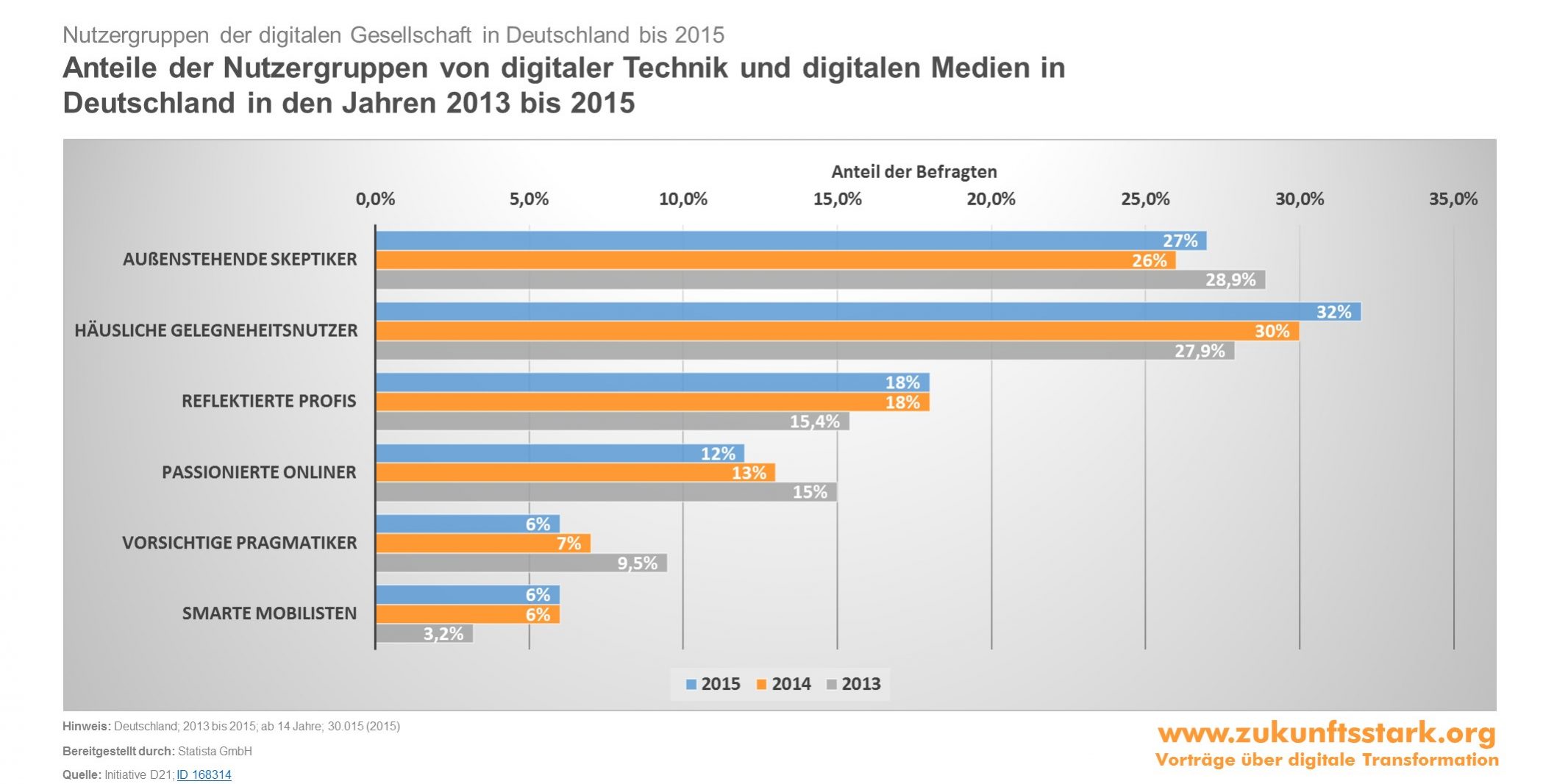 Trotz einer großen Verbreitung digitaler Geräte wie Smartphones oder Computern und dem beginnenden Umbruch von ganzen Branchen durch digitale Technologien, gibt es noch fast ein Drittel der Bevölkerung, der dieser Entwicklung weiterhin eher skeptisch gegenübersteht. Beim Thema dgitaler Wandel in Gesellschaft und Unternehmen ist es wichtig diese Gruppe auch mit einzubeziehen, um eine erfolgreiche digitale Transformation zu ermöglichen.